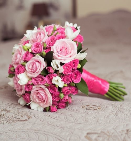 رنگ صورتی رنگ دختر خانم هاست. انتخاب رز های صورتی و یا رز های لب ماتیکی در دسته گل عروس بسیار جذاب و قشنگ است. معمولا در دیزاین های اروپایی دسته گل عروس رز صورتی را با گل های ارکیده سفید ترکیب می کنند. البته رز صورتی را با گل ای بسیار زیادی می توان ترکیب کرد. این دسته گل مناسب نامزدی نیز می باشد.